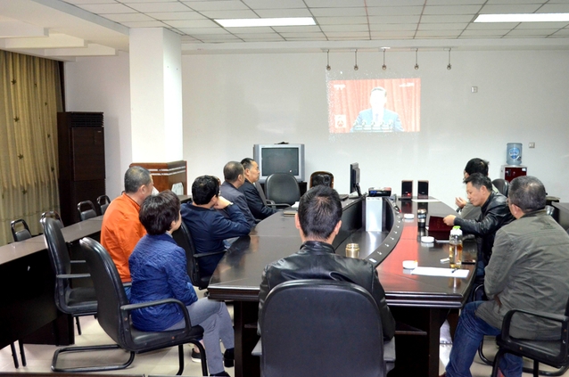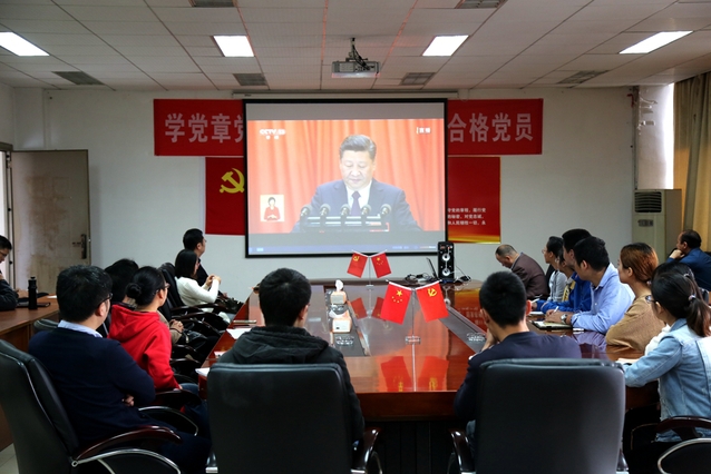 机关业务单位党员职工在行政楼底楼报告厅集中收看