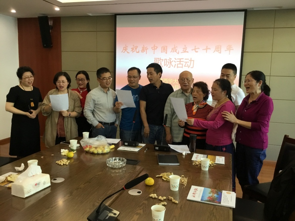 会上,与会人员举行了庆祝新中国成立70周年歌咏活动。大家分别演唱了《我和我的祖国》《我的祖国》《今天是您的生日》等歌曲,表达了大家对祖国母亲的无限热爱。
