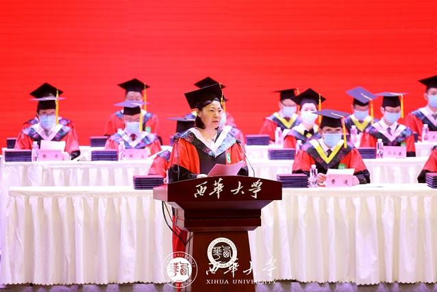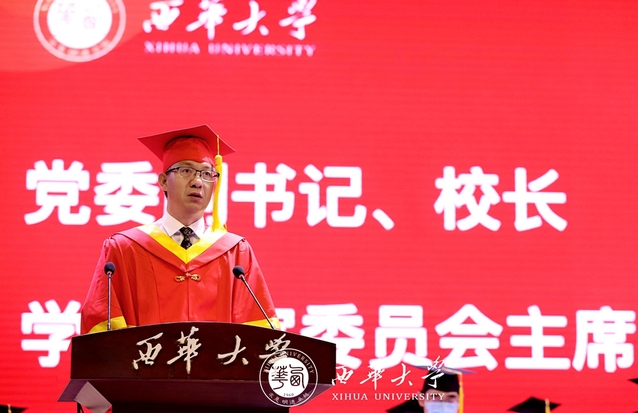 毕业典礼暨学位授位仪式在庄严的国歌声中拉开了帷幕。校长刘树根作毕业致辞:“由于疫情防控要求,今年的毕业典礼,学校只能安排300名学生作为代表现场授位,其余同学通过分会场、网络来参与今天的典礼……”刘校长对不能亲手为每一位毕业生拨穗授位、不能与每一位毕业生握手祝福、不能与每一位毕业生合影留念表示遗憾,同时他指出,即便如此,师生一样共同拥有值得珍藏的西华记忆,母校也为大家留下了青春的印记。他深情寄语同学们:“希望同学们眼里有阳光,守正奉献,做有家国情怀的西华人;希望同学们心中有梦想,行稳致远,做有理想抱负的西华人;希望同学们脚下有力量,砥砺奋进,做有责任担当的西华人。”刘树根校长的谆谆教诲,赢得了现场同学们的热烈掌声。