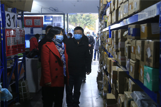 在侧校门快递点,边慧敏询问了师生寄取快递的情况,要求快递点要做好卫生消杀和通风,保证学生有序安全收取快递。
