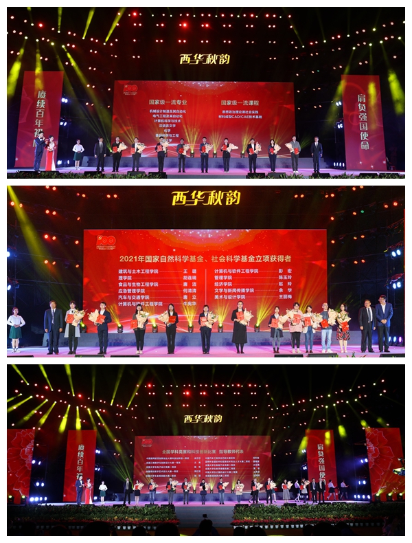 晚会期间,学校举行了隆重的颁奖仪式,对9名国家一流专业和一流课程代表团队教师,11名2020-2021年国家自科基金立项获得者、国家社科基金立项获得者代表,11名指导学生在全国各类学科竞赛和科技创新比赛中获得优异成绩的指导教师,10名2021年度“我最喜爱的老师”和10名2021年度“西华之星”获得者进行表彰。