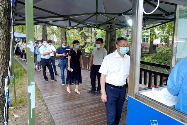 余孝其一行来到一食堂旁的核酸检测点,带头排队参加核酸检查。看到师生排队较长的情况后,余孝其向现场的管理人员和后勤保障服务人员反复叮嘱,校园管控期间师生员工活动空间受限,务必树立以人为本的理念,用心用情做好餐饮服务和生活保障工作,努力为师生创造平安健康、便利舒适的学习生活环境,要鼓励师生增强信心、共抗疫情、共克时艰。