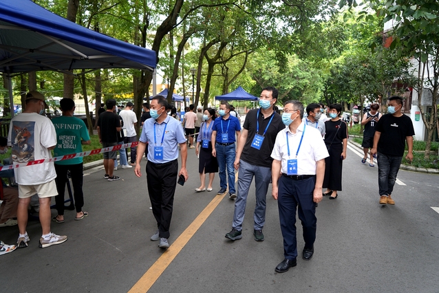 在核酸检测现场,余孝其代表学校对来自广安市岳池县援助郫都区的核酸检测的15名医护人员为学校疫情防控工作给予的巨大支持表示感谢,对他们“舍小家、顾大家”的工作精神表示敬意,他要求相关部门要按照“应检尽检、一个不漏”的原则,做好做细相关保障工作,确保郫都校区、西华苑(北苑)所有人员参与完成核酸检测。据悉,在广安驰援核酸检测取样队伍里,最大的年龄53岁,最小的年龄22岁,队伍里有党员、有团员、有青年,他们与学校广大党员干部、工作人员、师生志愿者一道,同心同行、并肩鏖战,争分夺秒地与时间赛跑,湿透的衣衫,疲惫的身影,就是他们努力工作的真实写照。